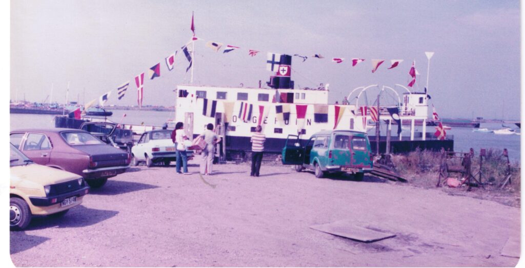 Our last ship wa the Norwegian built car Ferry Folgefonn. She was acquired by us in 1981 and was converted to serve as a yacht club. The old wheelhouse and passenger area on the top deck were converted to a bar which gave panoramic views across the river. On fine days we can spill over out into the promenade deck.